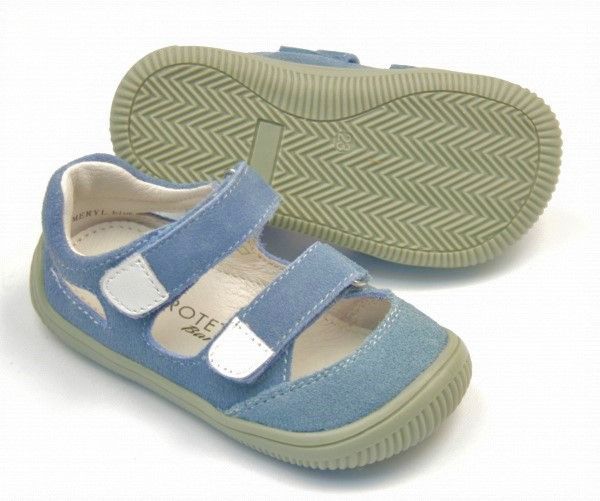 BAREFOOT sandálky od slovenské firmy Protetika na suché zipy. Svršek: broušená kůže. Podšívka: kůže. Obuv je velmi lehká, maximálně ohebná podešev. Dostatek místa pro prsty. Vyjímatelná kožená stélka bez podpory klenby. Vyvýšená podešev zabraňuje okopání. Obuv nemá zpevněný opatek. Protiskluzová gumová podrážka.