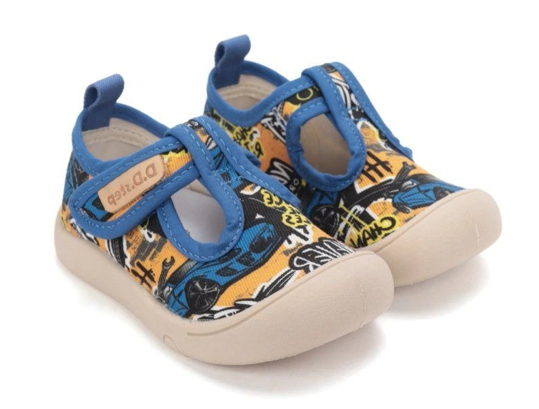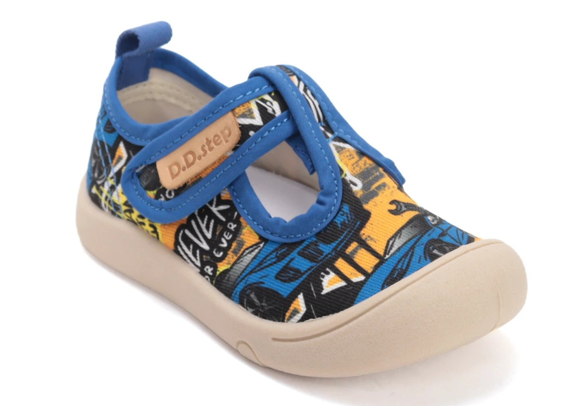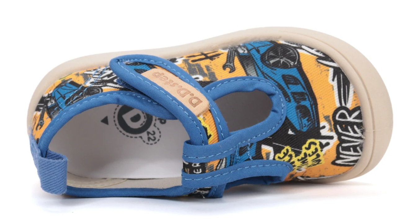 Plátěnky od firmy D.D.step na suchý zip přes nárt. Vyjímatelná kožená stélka s mírnou podporou klenby. Obuv má mírně zpevněný opatek, vyvýšená podešev zabraňuje okopání.