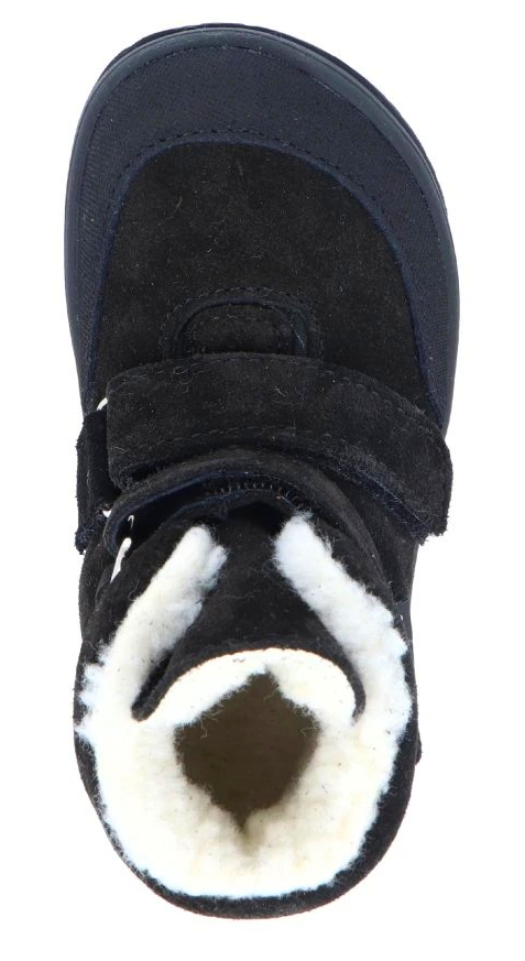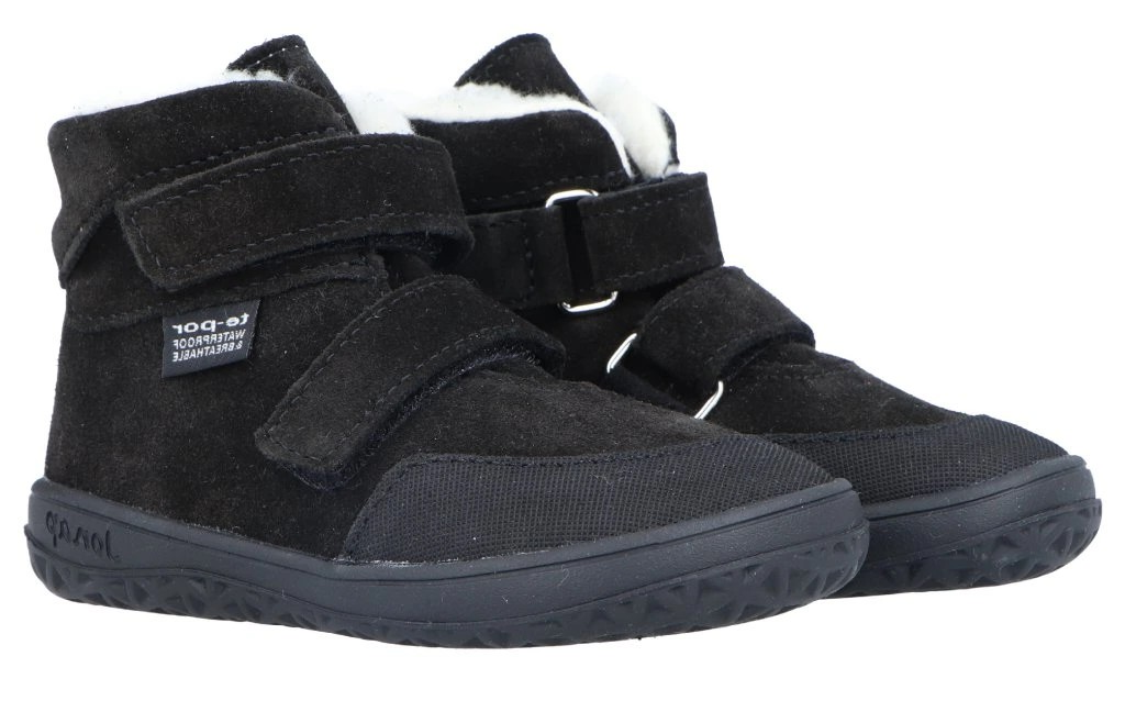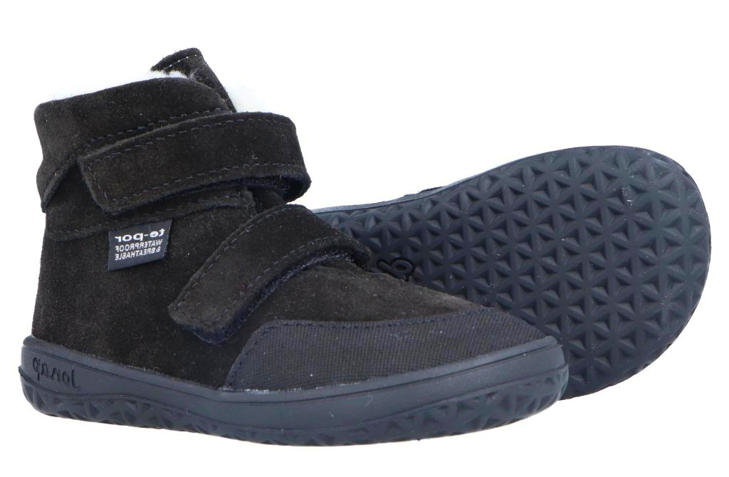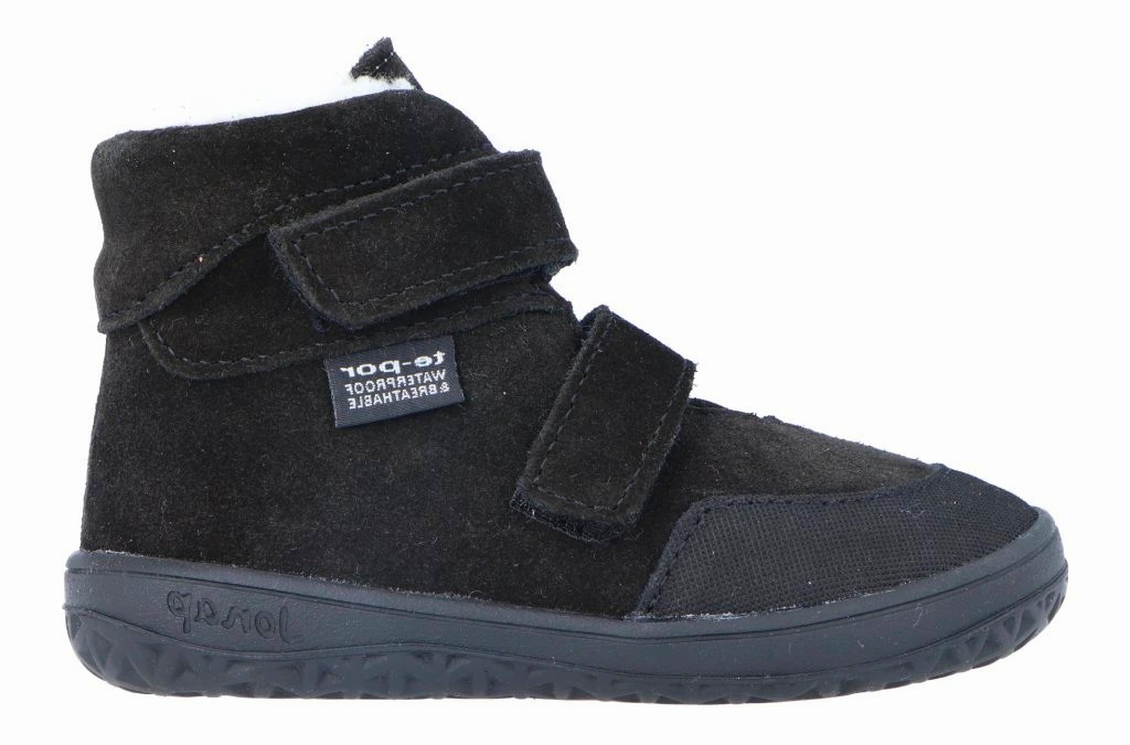 Barefoot zimní kotníčková obuv od české firmy Jonap s membránou Te-por. Anatomicky modelovaný svršek obuvi. Svršek obuvi - kombinace broušené kůže a hydrofobního textilu a membránové podšívky s páskou Tepor (Membrána zabraňuje pronikání vlhkosti zvenčí do boty, a na druhé straně propouštět z obuvi směrem ven vodní páry, které se v botě vytváří. Myšlen tím je pot z chodidel. Nohy tak jsou neustále v suchu a teple.) Podšívka obuvi - kožíšek ( ovčí rouno). Široké špičky bot - jsou vhodné pro volný pohyb prstíčků. Extrémně lehká, ohebná a široká podrážka v prstové části.
