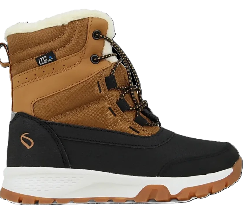 Svršek: Svršek: polyuretan, nylon, guma. Uvnitř zateplené umělou kožešinou. Vyjímatelná stélka. Robustnější protiskluzová podrážka. Podrážka je vyrobena z termoplastické gumy. Pevný opatek.
