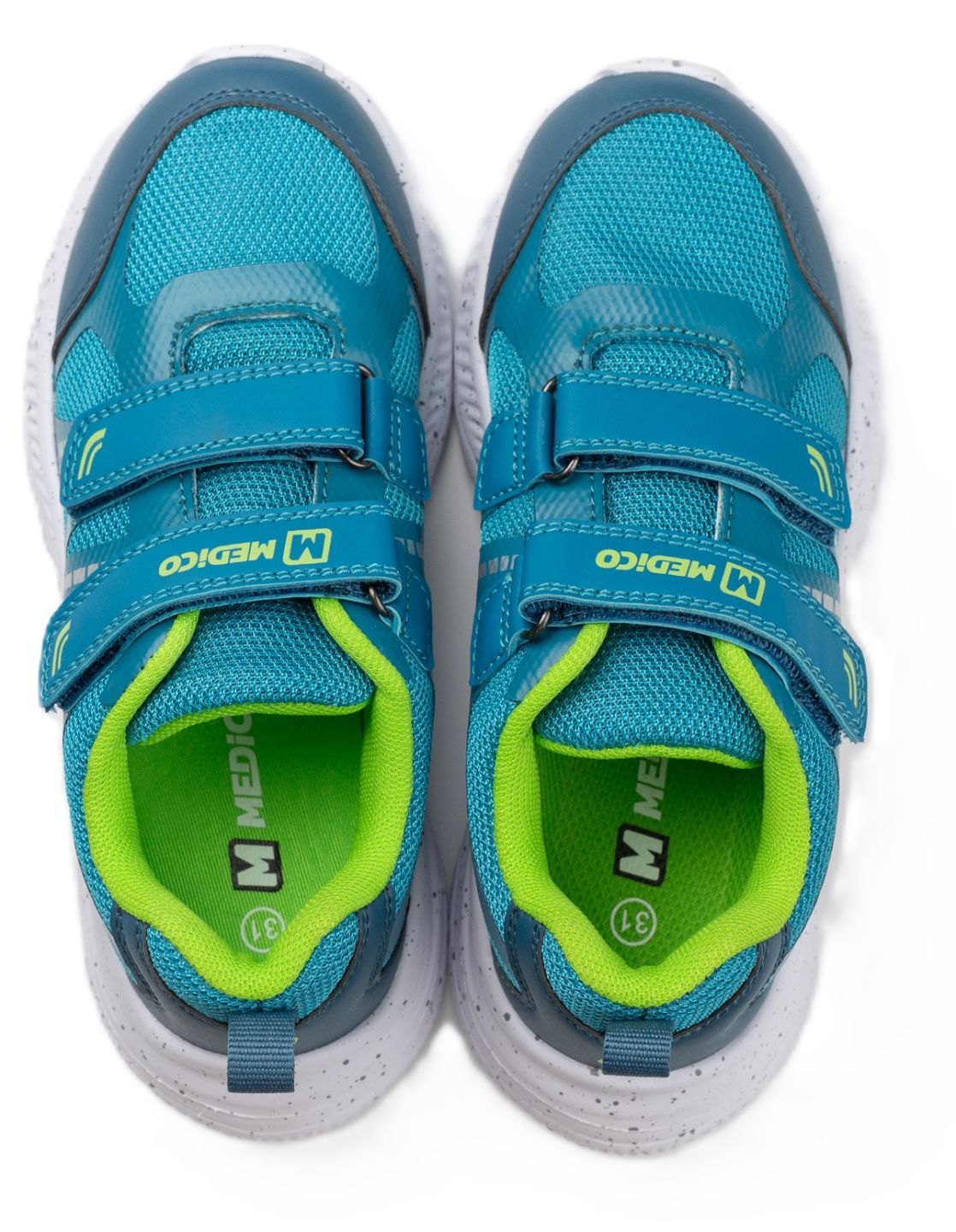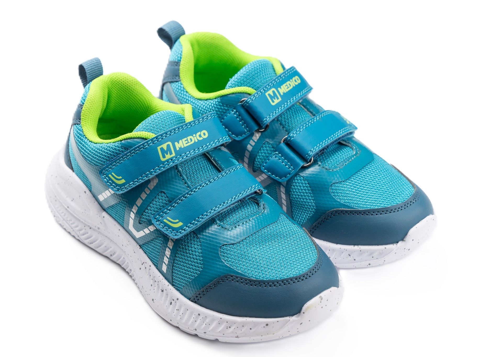 Lehké chlapecké tenisky se zapínáním na suchý zip. Vyvýšená podešev zabraňuje okopání. Obuv je velmi lehká. Bílá podrážka. Vyjímatelná anatomicky tvarovaná stélka s paměťovou pěnou. Pevný opatek. Vzadu poutko pro snadnější obutí.