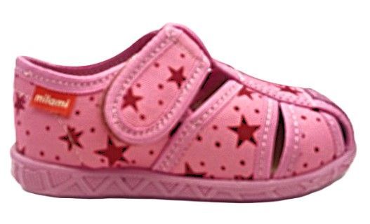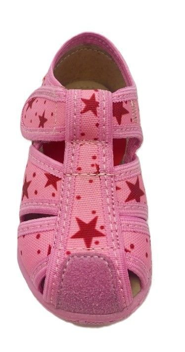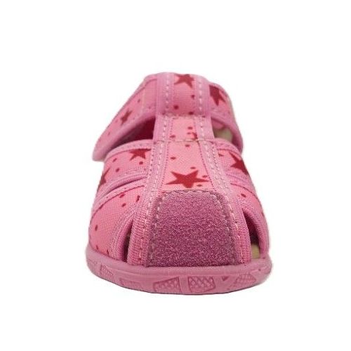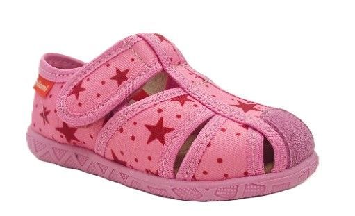Dívčí textilní sandálky se zapínáním na suchý zip. Obuv je vyrobena v Srbsku. Kožená anatomicky tvarovaná stélka. Pevný opatek. Špička opatřena praktickým okopem z broušené kůže.