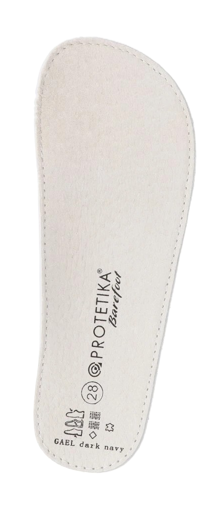 Lehké a prodyšné barefoot tenisky od slovenské firmy Protetika. Zapínání: stahovací tkanička s brzdičkou. Mírně zpevněný opatek. Vyjímatelná kožená stélka bez podpory klenby. Flexibilní podrážka. Vyvýšená podešev zabraňuje okopání