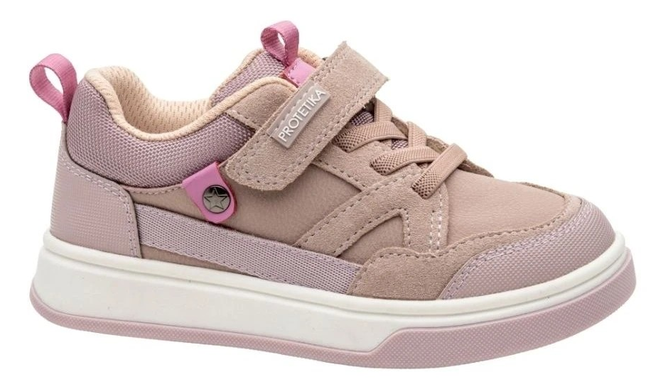 Dívčí celoroční nízká obuv od slovenské firmy Protetika na suchý zip a elastické tkaničky pro snadné obouvání a bezpečnou fixaci na noze. Svršek: kůže. Podšívka: textil. Vyjímatelná kožená anatomicky tvarovaná stélka. Sportovní podešev je zvýšená, odolná a tlumí nárazy při chůzi. Špička bot je chráněna proti mechanickému poškození. Stélka jemně podporuje podélnou klenbu chodidla