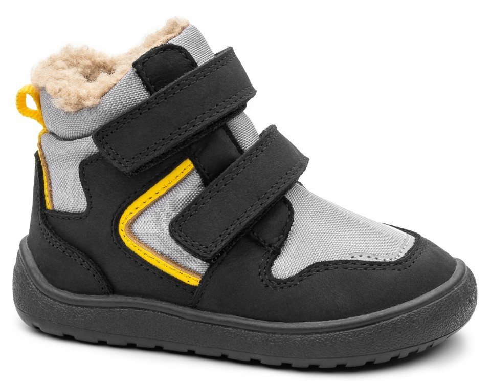 Chlapecké barefoot zimní boty od slovenské firmy Protetika. Svršek je vyroben z hladké, omyvatelné kůže vv černo-šedé kombinaci se žlutými detaily.